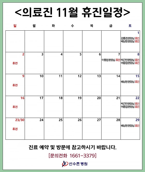 배상원 원장님 : 11/1(토), 11/15(토), 11/29(토) 휴진